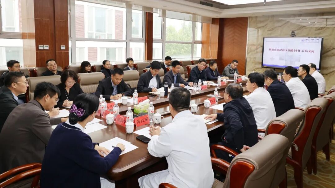 为加强区域间医疗卫生工作的交流与合作,共同提升医疗服务与管理水平,2025年10月16日下午,津南区卫健委、津南医院一行14人在津南区卫健委党委书记曹孔承带领下莅临我院进行学习交流。宝坻区卫健委党委书记、主任李培森,副主任王喜、李光耀和委党委办公室、医政医管科负责人参加。我院党委书记王文志,院长门学博,党委副书记、副院长吴秀春,副院长苏红军、赵鸿杰、段少华及相关职能处室负责人参加座谈交流。