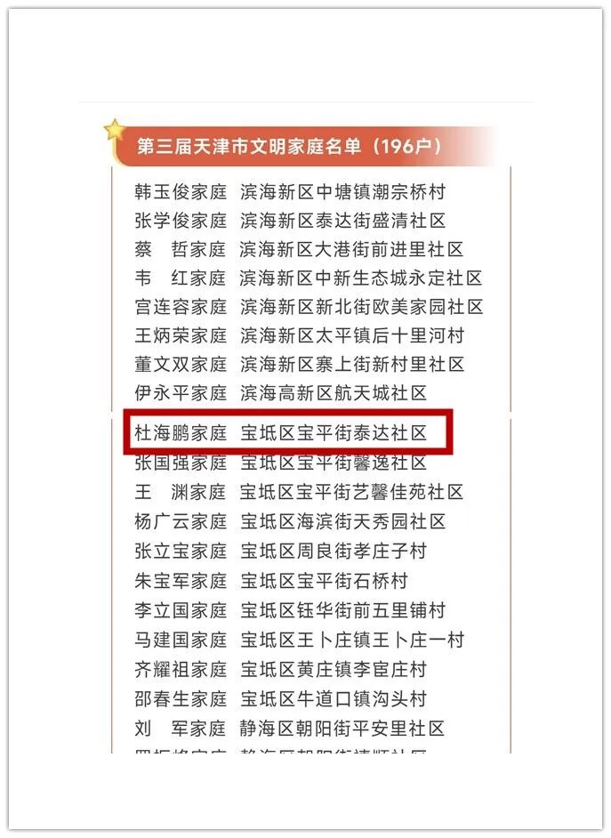 近日,中共天津市委宣传思想文化工作领导小组召开天津市精神文明建设先进表彰座谈会,决定授予196户家庭第三届天津市文明家庭称号,其中,我院医生杜海鹏家庭被授予第三届天津市文明家庭称号。