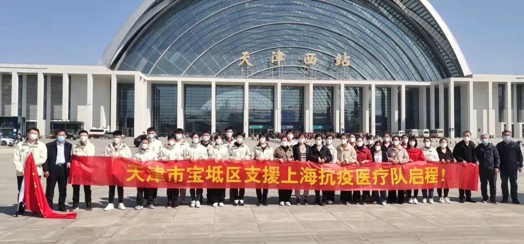 接到支援任务后,因时间紧急队员们来不及过多的准备,甚至来不及和家人一一告别,便急忙赶往医院完成出行前需要的核酸检测和影像检查。医院行政后勤部门的工作效率非常高,服务也十分贴心,已将支援需要的防疫物品、生活物资准备到位。4月3日早上7点,医院党委书记王广舜作出发前动员讲话。他叮嘱大家在保护好自己的前提下,要把支援天津海河的经验、空港的经验、院内防控的经验带到上海去,帮助上海人民早日战胜疫情,要发扬担当、奉献精神,为宝坻医疗行业争光,为天津卫健系统争光!同时叮嘱大家不要有后顾之忧,医院是队员们的坚强后盾,不管家里有任何困难,都可以第一时间联系医院,医院会想尽办法帮助大家解决,队员们只管安心在上海执行任务!王书记坚定且温和的话语抚平了队员们心中的焦虑和担忧,增强了队员们“打胜仗、零感染、必凯旋”的信心和决心。之后医院感染管理科的苏国发主任对队员们再次强调了疫情防控各项工作的重点环节和注意事项。7点30分,医院领导、科室主任、护士长及同事们用热烈的仪式欢送援沪医疗队出征。9点,援沪医疗队在宝坻区卫健委陈会臣书记和门学博主任的护送下到达天津西站,出发前陈书记向队长王轩进行了授旗仪式,成立了宝坻区援沪医疗队临时党支部。陈会臣书记和门学博主任向队员们提出要求,希望医务工作者发扬“敬佑生命、救死扶伤、甘于奉献、大爱无疆”的职业精神,要注意自身防护,发挥专业特长,运用丰富的疫情防控经验帮助上海人民战胜疫情,尽早平安凯旋!