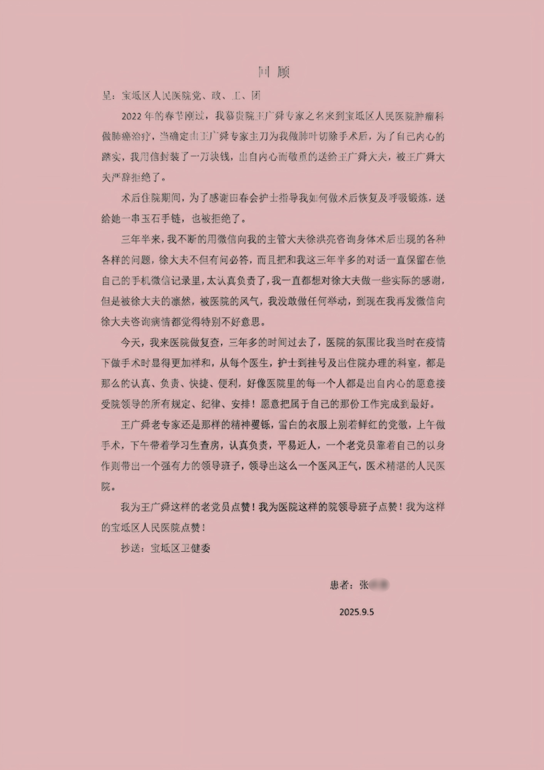 近日,我院收到患者张先生的一封感谢信,信中讲述了他自2022年在我院肿瘤科接受肺癌手术及术后康复过程中的温暖经历。信中特别提到,王广舜教授在术前坚决拒收其红包,并以精湛医术顺利完成手术;主管护士田春会以专业和耐心指导患者术后恢复,婉拒了其赠送的玉石手链。三年来,主管医生徐洪亮始终通过微信耐心解答患者咨询,保留完整沟通记录,体现出高度负责的职业精神。张先生在今年复查时再次深切感受到了医院的风清气正,称赞医护人员认真负责、服务便捷,并对王广舜教授以身作则的工作作风表示敬佩。